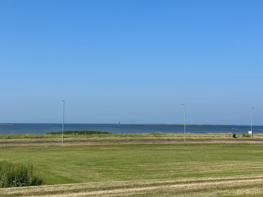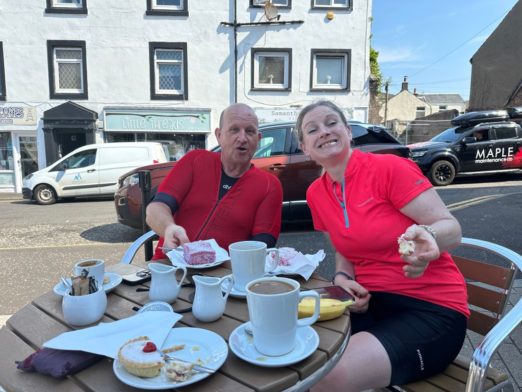 The landscape was undulating , but I must confess I am not afraid of the hills any more! I have done so many I am now getting more efficient at getting up them. Irvine was the first Town we went through and was pretty straightforward. We then headed for the coast to Ardrossan and then cycled along by the sea for a good spell. We had a rolling stop here for water and even if we don’t need to fill up it encourages us to drink in this warm weather. When we left Kilmarnock this morning it was 18 degrees and we knew it would be a scorcher. So far I am pretty amazed by the weather! Who knew when we booked this we would have sunshine all the way!! Training was done in all the worst conditions and the ride in all the best!